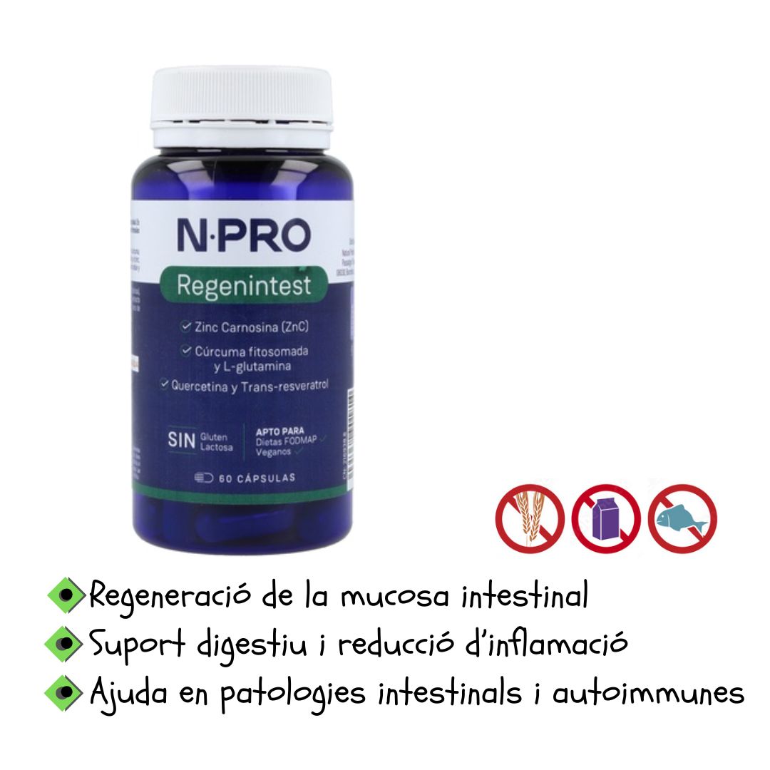 Regenintest en càpsules és un suplement dissenyat per a la regeneració de la mucosa intestinal i el suport digestiu. Conté L-glutamina, zinc carnosina i extractes vegetals com l’àloe vera, regalèssia deglicirrizinada (DGL), camamilla i cúrcuma, que actuen de manera sinèrgica per protegir i reparar la paret intestinal.