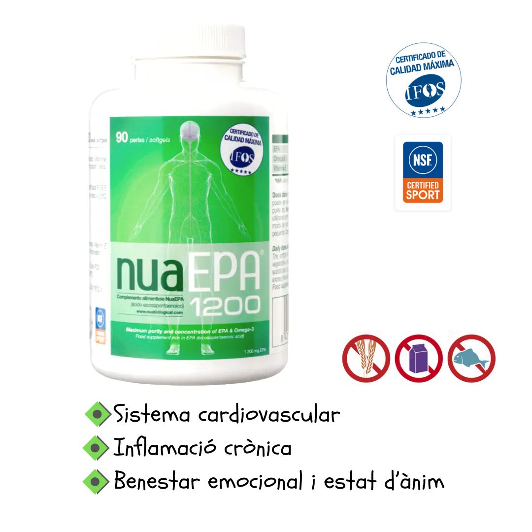 NUA EPA 1200 és un concentrat d’omega-3 d’alta puresa, amb almenys 1.200 mg d’EPA (àcid eicosapentaenoic) per càpsula, en forma de triglicèrid per afavorir-ne l’absorció. Cada perla inclou també vitamina E natural com a antioxidant.