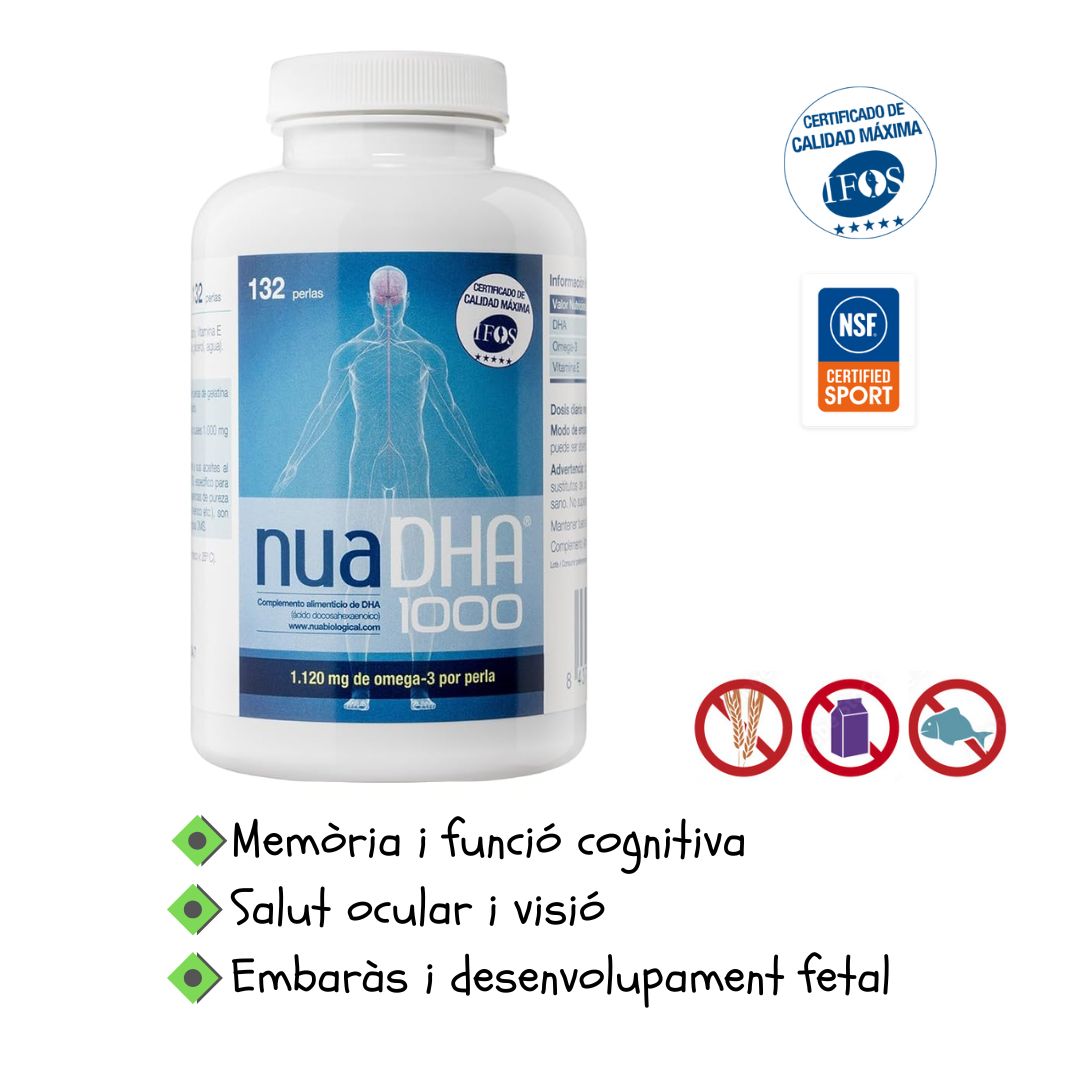 NUA DHA 1000 és un suplement d’omega-3 d’alta puresa amb una concentració elevada de DHA (àcid docosahexaenoic), en forma de triglicèrid natural per a una millor absorció. Cada càpsula aporta 1.000 mg de DHA purificat i vitamina E natural.